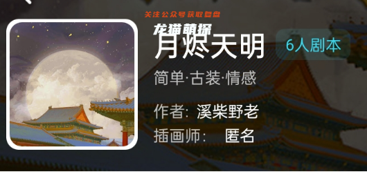 《月烬天明:我是谜》是一款由溪柴野老创作的剧本杀游戏,适合6人参与,预计时长为3小时。游戏的题材类型为简单、古装、情感,让玩家们沉浸在古代风情、爱情纠葛和迷局之中。